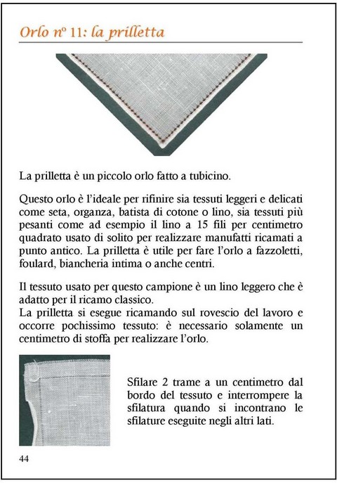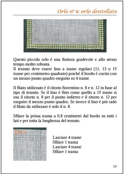 E' spiegato come eseguire i vari tipi di orlo adatti per confezionare tovaglie, tende, lenzuola e asciugamani. Per ogni tipo di manufatto trovate la spiegazione del tipo di orlo consigliato.
