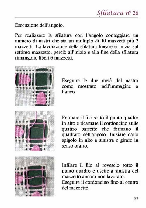 Quando la sfilatura è eseguita sul perimetro del manufatto che realizziamo sorge il problema "angolo", nell'esecuzione di 5 sfilature troverete le spiegazioni e le foto per l'esecuzione dei relativi angoli.